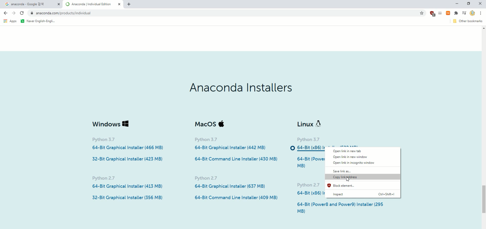 1. Anaconda 다운로드 링크 복사하기