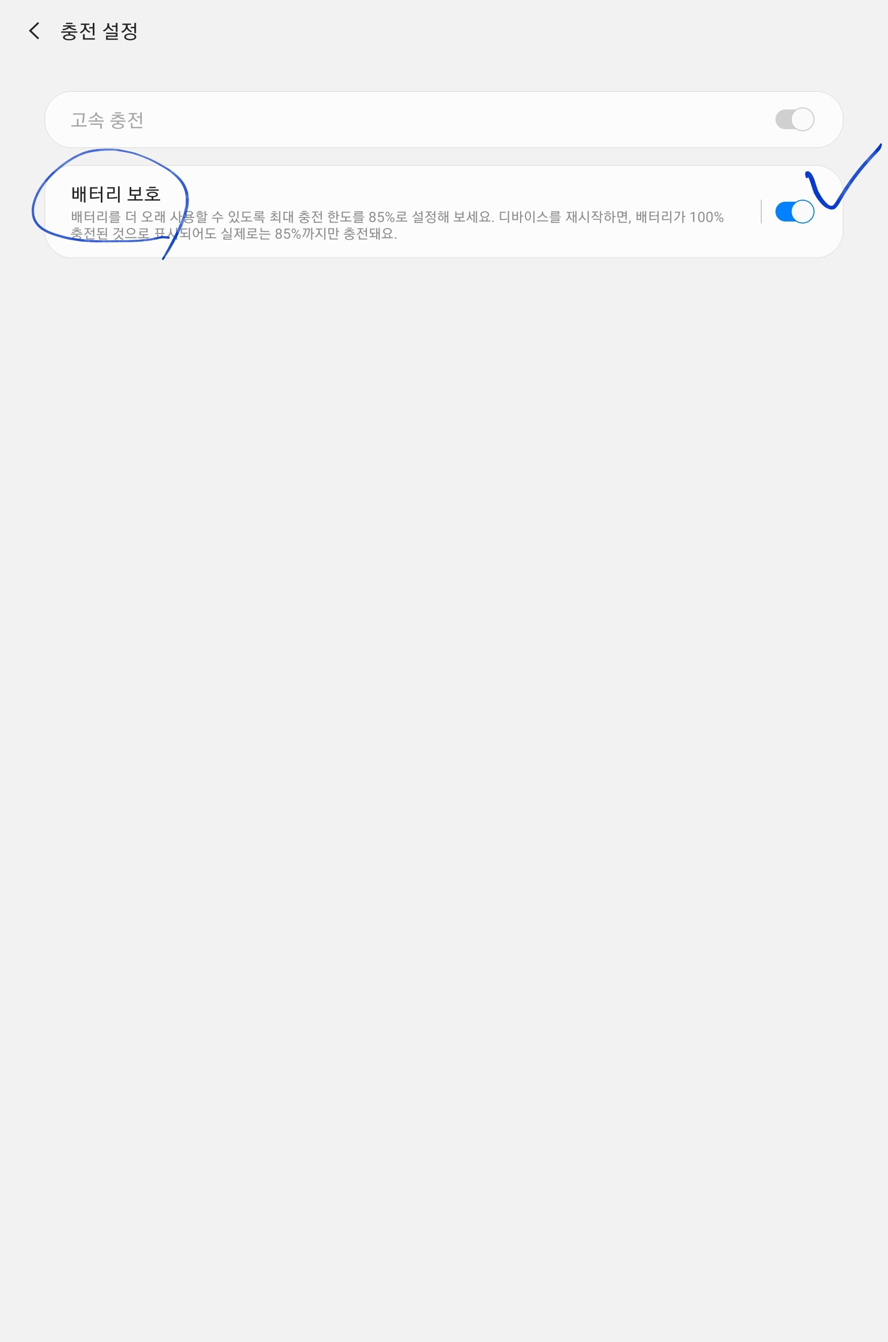 배터리 보호를 켜시면 됩니다. 재부팅하라고 하는데 재부팅 하시면 재부팅 후부터 설정이 완료됩니다.(100%로 표시되지만 실제로는 85%까지 충전됨)