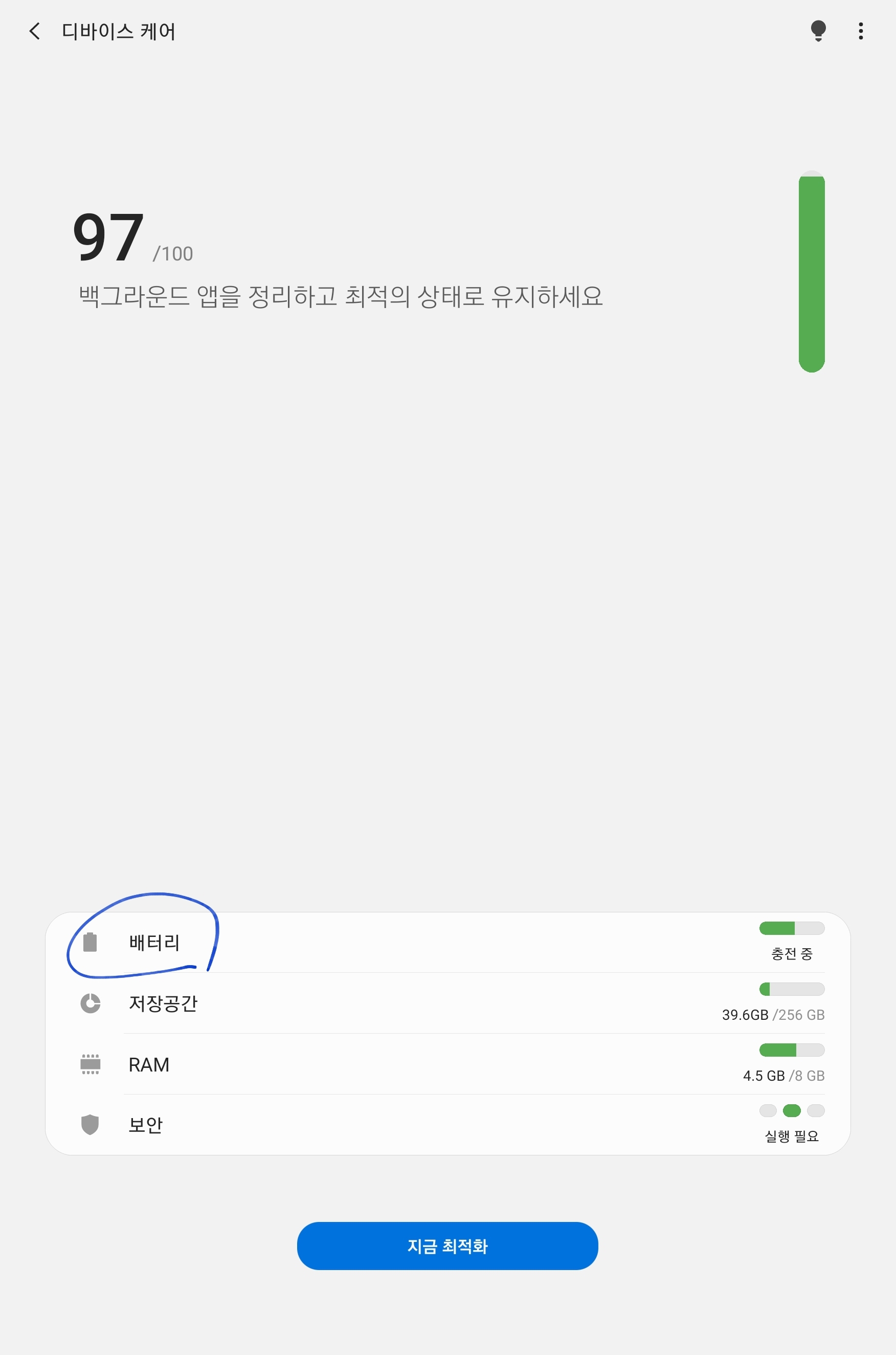 현재 스마트기기에 사용되는 배터리는 완충을 하지 않고 사용시 더 오래 쓸수 있다는 것이 알려져 있습니다. 갤럭시 탭 S7/S7+ 에서도 이 설정을 할 수 있는데요. 설정 - 디바이스 케어 - 배터리 항목에서 설정 가능 합니다. 아래 스크린샷을 보시죠.