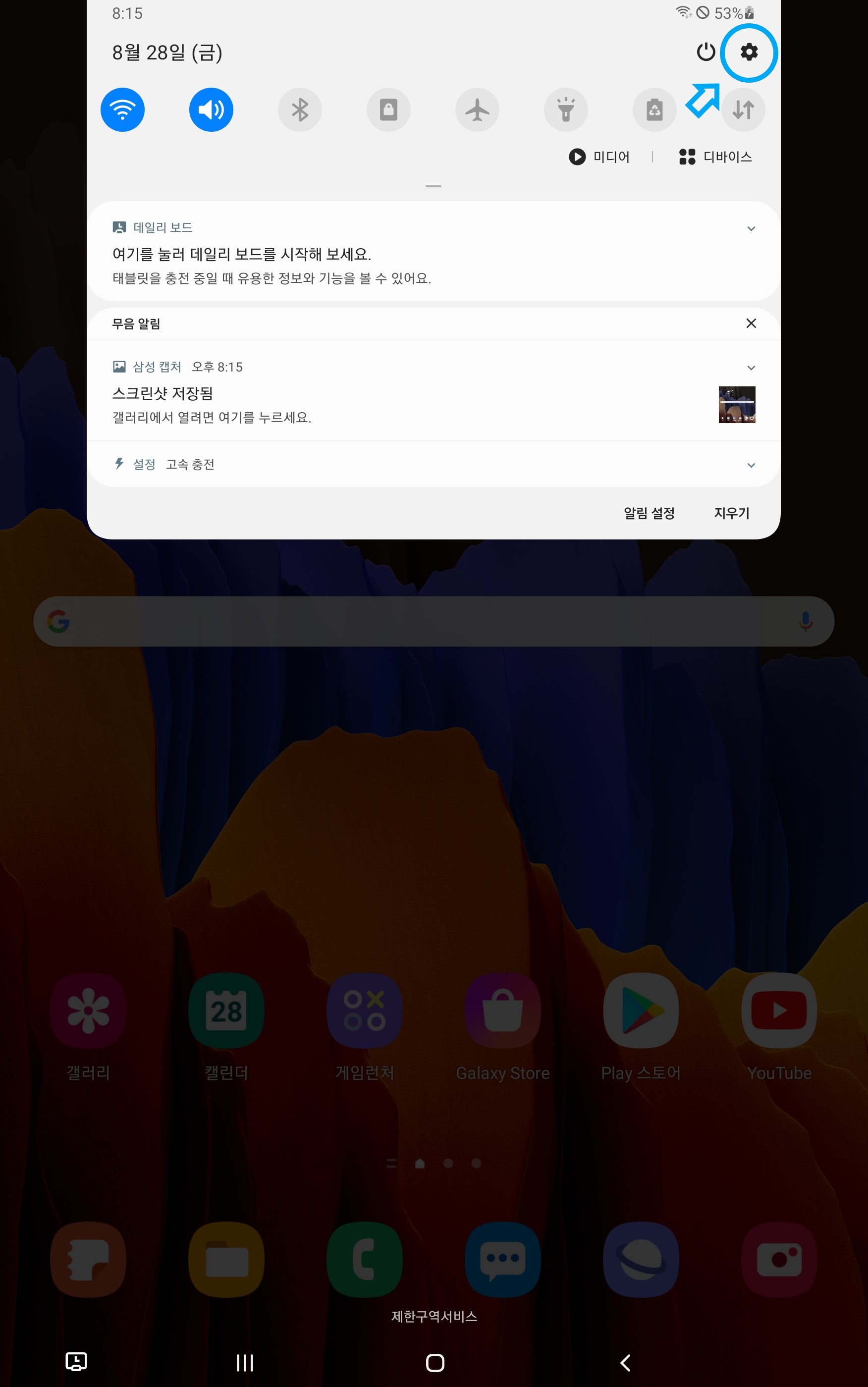 태블릿 설정으로 들어갑니다. (하늘색 원으로 마크된 아이콘)
