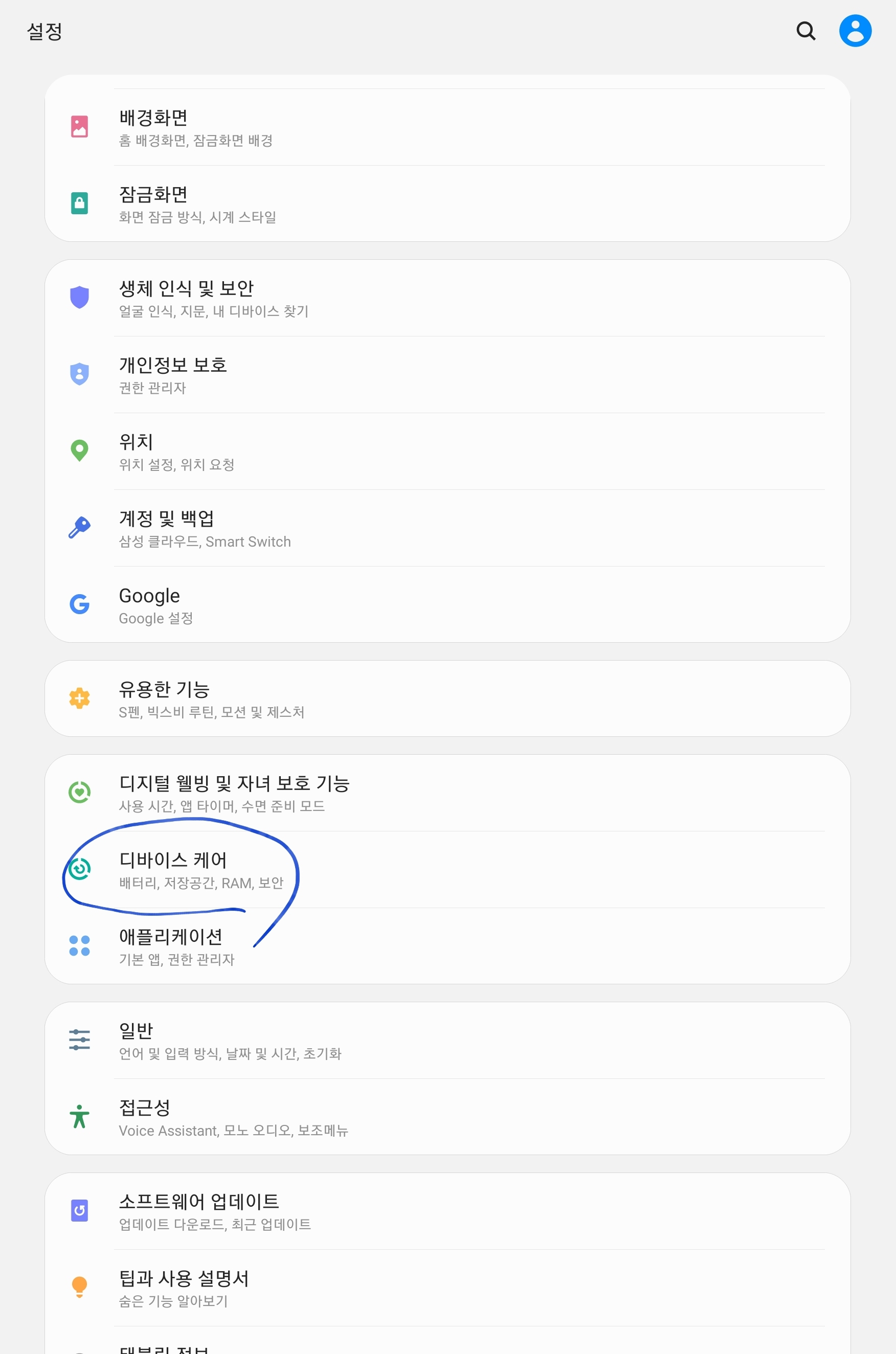디바이스 케어 항목을 누릅니다.